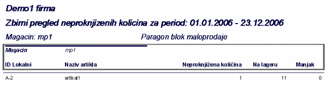 - u slučaju da na lageru ne postoji dovoljan broj artikala paragon blok se ne može proknjižiti. Ovo dugme omogućava da se za izabrani magacin i period dobije izveštaj o neproknjiženim količinama i sa stanjem lagera za njih.