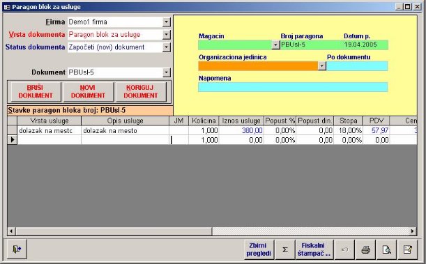 Program je namenjen za izradu paragon bloka pri maloprodaji roba i proizvoda, kao i za usluge i pazare. Kod paragona za robu mogu se uneti i usluge (kao kod faktura).