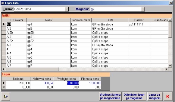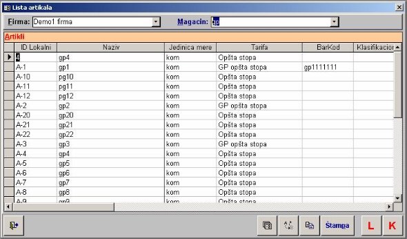 Izborom stavke Artikli iz ponuđenog menija pristupamo šifarniku gotovih proizvoda, koji sadrži matične podatke o asortimanu koji se proizvodi. Matični podaci sadrže podatke kako je to prikazano na slici (sl. 2). Šifarnik robe vodi se odvojeno za svaki magacin i jedinstveno je određen firmom i magacinom, koje biramo iz dve kombinovane liste imenovane sa «Firma» i «Magacin», koje se nalaze u gornjem delu ekranskog formulara. Ovde se može uneti šifarnik i uraditi izveštaji vezani za njega. Šifarnik robe se može unositi i u ostalim modulima. Nova šifra se unosi tako što se dođe u prazan red na kraju prikazane tabele na slici 2.