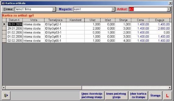 U gornjem delu formulara nalaze se tri kombinovane liste, za unos firme, magacina i proizvoda, kojima jedinstveno identifikujemo proizvod. Centralni deo formulara zauzima tabela sa poslovnim promenama nad proizvodom.