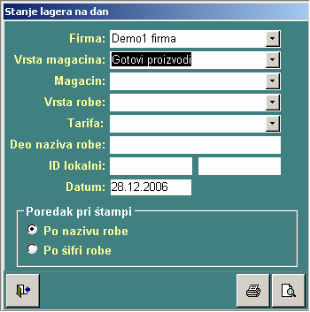 Izveštaj omogućava pregled stanja zaliha na dan po planskim cenama. Identičan je izveštaju u programu roba osim što prikazuje planske cene.