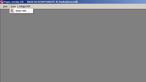 Izborom stavke «Popis robe» iz glavnog menija otvoriće se ekranski formular koji služi za unos i ažuriranje popisa robe (sl. 2). Popis se vrši u zavisnosti kako se vode zalihe, ali je uvek osnovica za obračun PDV-a nabavna (prosečna) cena za one količine koje su u manjku.