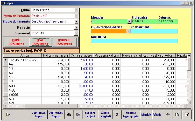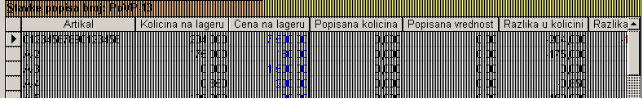 - Artikal –bira se izborom iz kombinovane liste, koja je ograničena na artikle iz šifarnika za uneti magacin u zaglavlju popisa. Unosom artikla počinje se unos svake stavke. Nakon izbora artikla program za obeležja «Količina na lageru» i «Cena na lageru» nudi podatke sa lagera, ukoliko oni postoje. Ako artikal nema lager, program će vas obavestiti o tome.