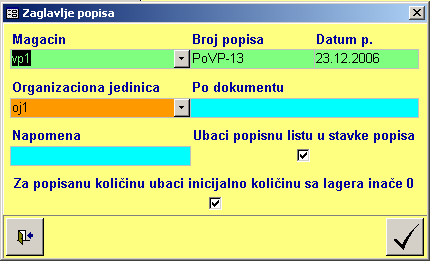 Ubaci popisnu listu u stavke popisa – ukoliko je uključeno, automatski pri unosu zaglavlja ubace se stavke popisa koje sadrže sve artikle koji se nalaze u magacinu. Popuni se kolona «količina na lageru» i kolona «cena na lageru» sa podacima sa lagera. U kolonu «Popisana količina» takođe se upiše vrednost sa lagera. Potrebno je nakon izvršenog popisa uneti «popisanu količinu» samo za one stavke koje imaju višak ili manjak. Takođe je moguće dodati nove stavke. Ukoliko se ne uključi ova opcija započinje se popis gde je potrebno uneti sve stavke.