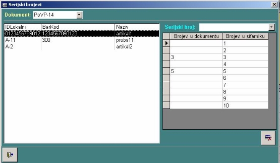 U levom delu formulara nalazi se lista artikala u zadatom magacinu koji se vode po serijskim brojevima, a u desnom delu ekrana se nalazi kombinovana lista i tabela artikala koji se popisuju po serijskim brojevima. Jednom izabrani artikal može se skinuti sa liste za izdavanje