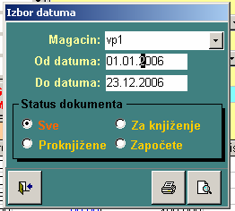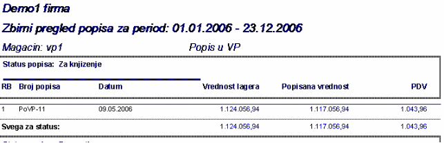 omogućava izradu izveštaja na osnovu urađenih popisa za neki magacin i period. Poziva se forma gde se vrši izbor magacina, perioda i statusa dokumenata.