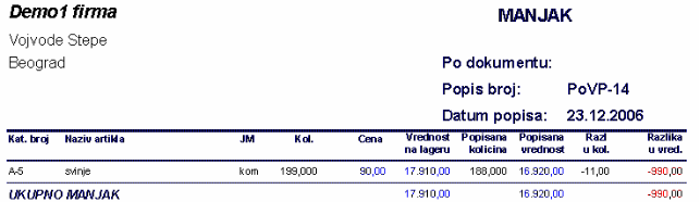 - prikazuje izveštaj o artiklima koji su u manjku po popisu.