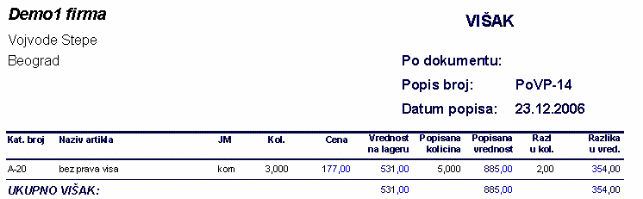 - prikazuje izveštaj o artiklima koji su u višku po popisu.
