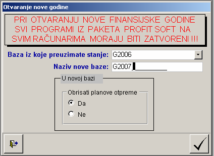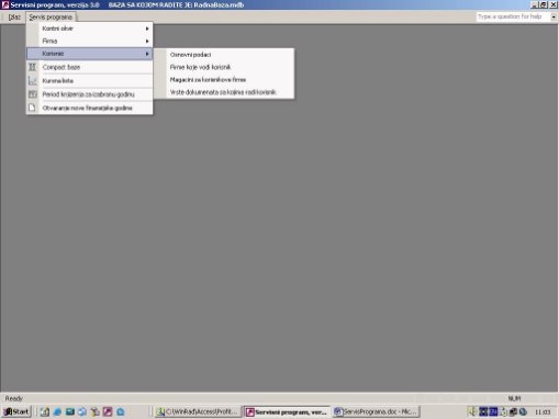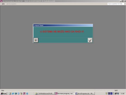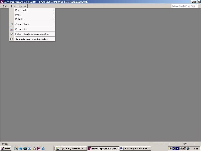 Otvara se forma za rad. Potrebno je voditi racuna da u sistemu niko ne radi i da svi programi iz ovog paketa budu zatvoreni (ne minimizirani). Ujedno se pravi i kopija baze na C:\