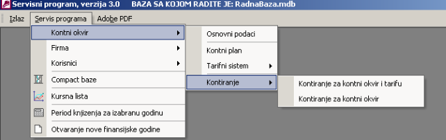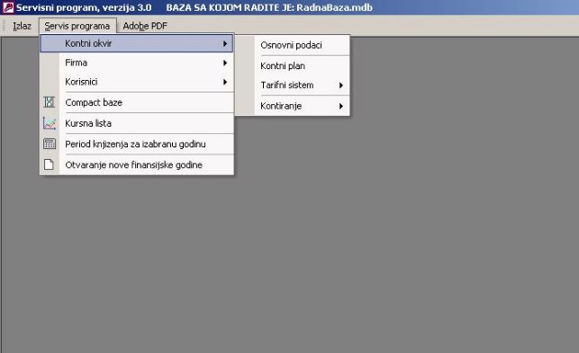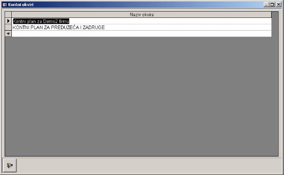 Ovaj deo programa služi za administraciju podataka vezanih za kontni okvir. To je prvo što se radi nakon startovanja sistema, odnosno programa. Kontni okvir je potrebno uneti jer se kasnije kod otvaranja firme on dodeljuje istoj. Na slici je prikazan podmeni opcije kontni okvir.