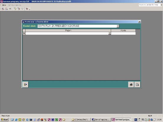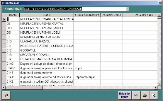 Kontni plan se unosi za svaki kontni okvir posebno. Prvo se preko combo box-a izabere neki od unapred unetih kontnih okvira. Za izabrani kontni okvir, ukoliko postoji, prikazuje se kontni plan.