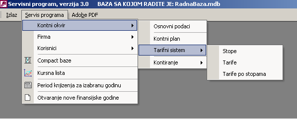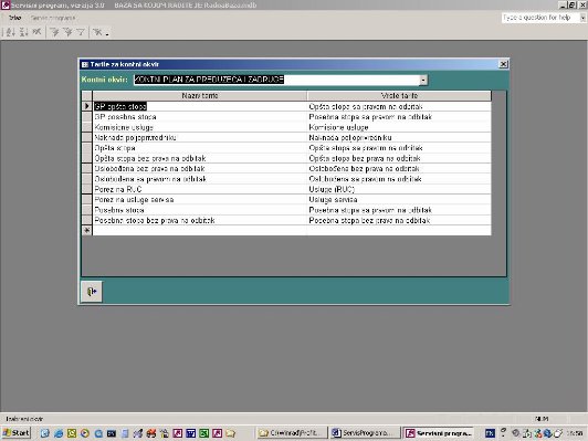 Ovde se unosi spisak tarifa koje važe za izabrani kontni okvir i koje su zakonsi određene. Tarife se ne mogu uneti iz drugih programa, već samo iz servisa. Kada dođe do zakonskih promena i uvede se ili izbaci neka tarifa izmene se ovde ažuriraju.