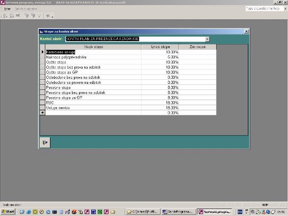 Ovde se unosi spisak stopa koje važe za izabrani kontni okvir i koje su zakonsi određene. Stope se ne mogu uneti iz drugih programa, već samo iz servisa. Kada dođe do zakonskih promena i uvede se ili izbaci neka stopa izmene se ovde ažuriraju.