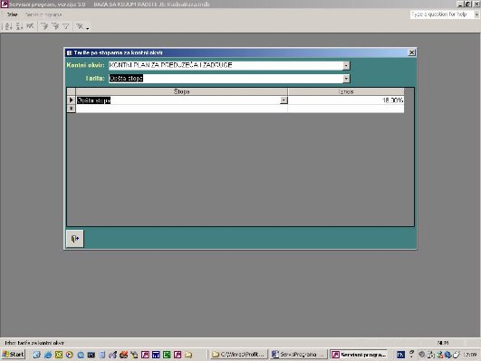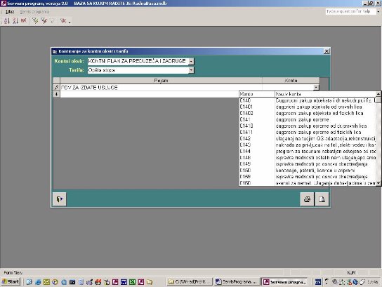Preko combo box-a se izabere neki od unapred unetih kontnih okvira. Za izabrani kontni okvir, ukoliko postoji, prikazuje se spisak unetih tarifa.