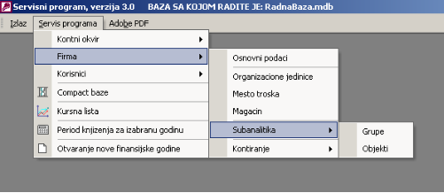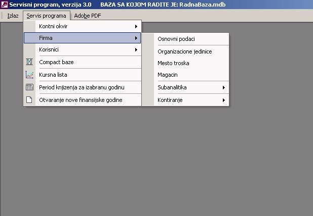 Ovaj deo programa služi za administraciju podataka vezanih za firmu. To je sledeći korak nakon kontnog okvira. Na slici je prikazan podmeni opcije firma.