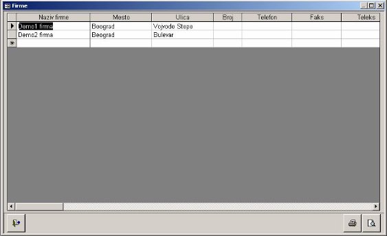 Služi za otvaranje firme. Potrebno je voditi računa da se ispravno unesu obavezni podaci jer oni određuju dalji rad programa. Takođe osnovni podaci o firmi ispisuju se prilikom štampe obrazaca i dokumenata. Program omogućava unos više firmi, tj. onoliko koliko dozvoljavaju resursi mašine na kojoj radite.