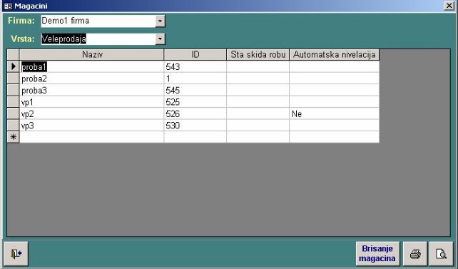 Prvo se izabere firma a zatim vrsta magacina. Vrste magacina su definisane u programu. Za jednu vrstu magacina može se uneti više njih, što znači da može biti npr. više magacina veleprodaje.