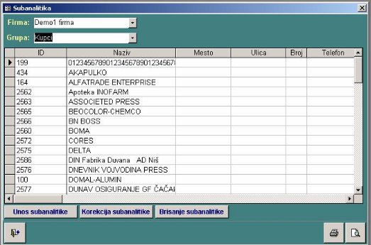 Prvo se izabere firma izborom preko combo boxa-a. Nudi se spisak ranije unetih firmi. Zatim se bira grupa subanalitike. One su definisane u programu i ne mogu se menjati. Za izabranu firmu i grupu prikazuje se spisak unetih podataka. Administracija podataka vrši se preko komandnih dugmadi. Korekcija i brisanje odnose se na subanalitku na kojoj je pokazivač u tabeli.