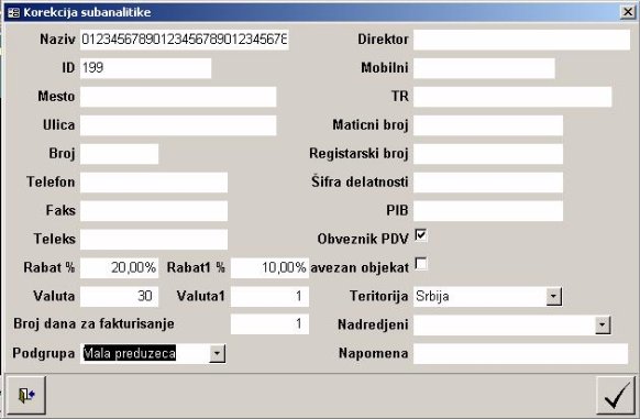 - Podgrupa – podatak postoji kod svih grupa subanalitika. Omogućava da se za određenu subanalitiku u grupi unesu dodatni podaci o pripadajućoj podgrupi. Npr za kupce podgrupe mogu biti: mala preduzeća, srednja preduzeća, velika preduzeća, ambasade i sl. Kasnije je omogućena izrada izveštaja po grupama i podgrupama. Forma za unos podgrupa poziva se dvoklikom mišem ili sa tasterom F5.