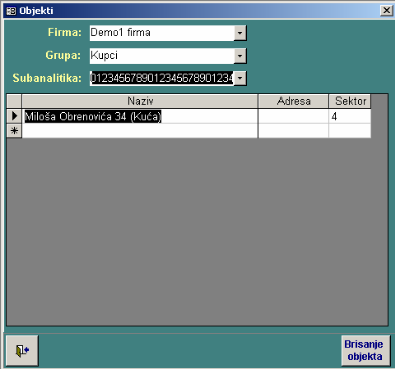 Ovde se unosi spisak objekata koje ima subanalitika. Objekti se unose za svaku subanalitiku posebno. Prvo se izabere firma, zatim grupa subanalitike i na kraju subanalitika. U tabeli se prikazuje spisak objekata. Novi objekat se unosi tako što se unese njegov naziv. U toku rada pri izboru subanalitike može se izabrati i objekat.