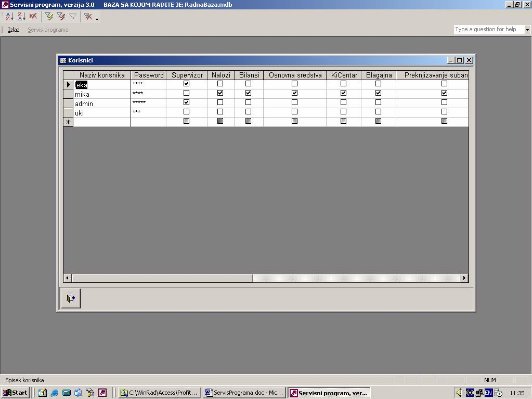 Vrši se otvaranje korisnika i dodela prava. Unosi se naziv korisnika i password. Ukoliko se kod korisnika izabere kolona Supervizor onda on ima sva prava u svim programima i nije potreban dodatni izbor opcija.