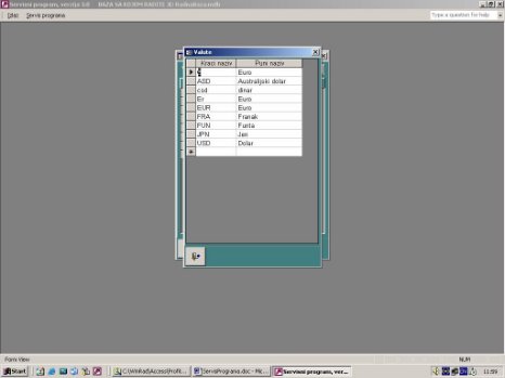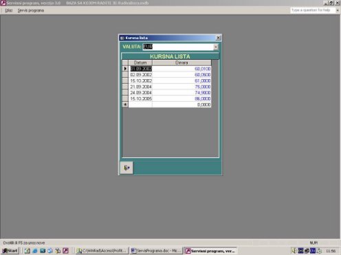 Prvo se vrši izbor valute. U tabeli se nakon toga dobije kursna lista. Novi kurs se unosi na kraju liste za izabrani datum. Nova valuta se unosi dvoklikom na combo box ili pozivom na taster F5. Poziva se forma za unos valute.